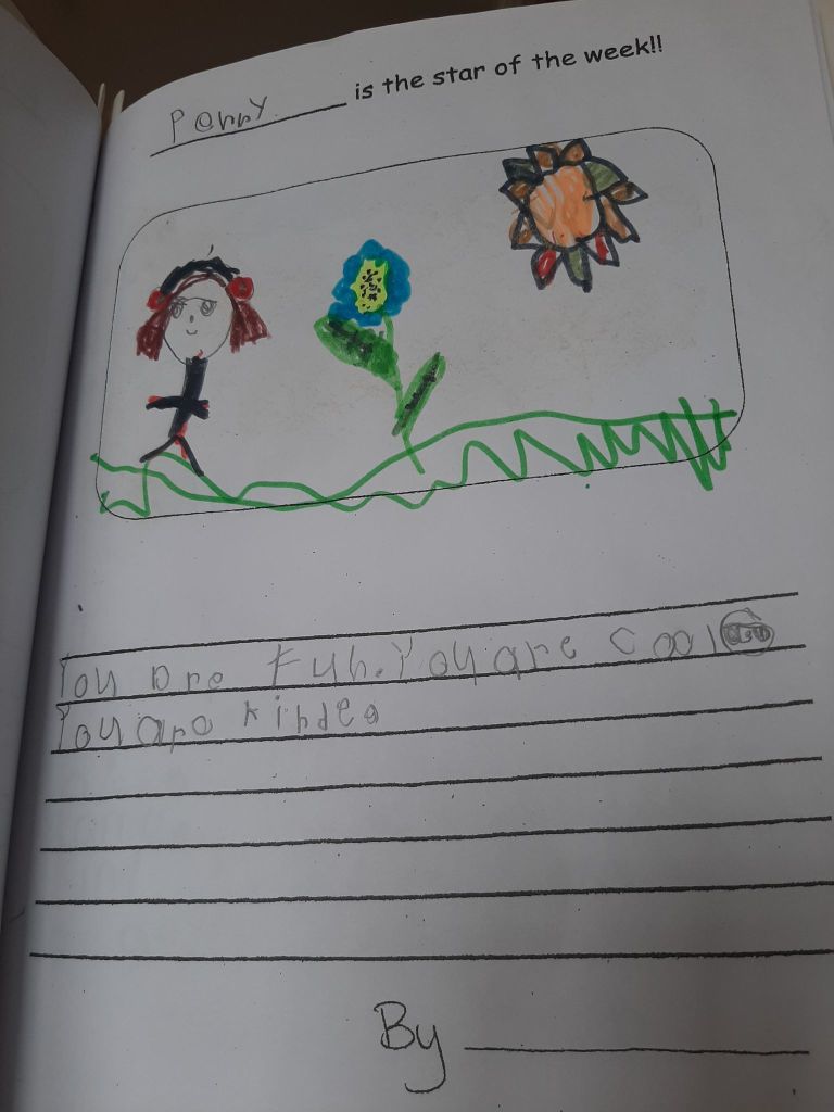 She wrote, “Penny is nice. She is pretty. I play with her a lot. She is my best friend. She is friendly to me. She is kind. She helps me a lot. That is why I like Penny.” (This is edited for clarity because the spelling errors were adorably 7 years old)