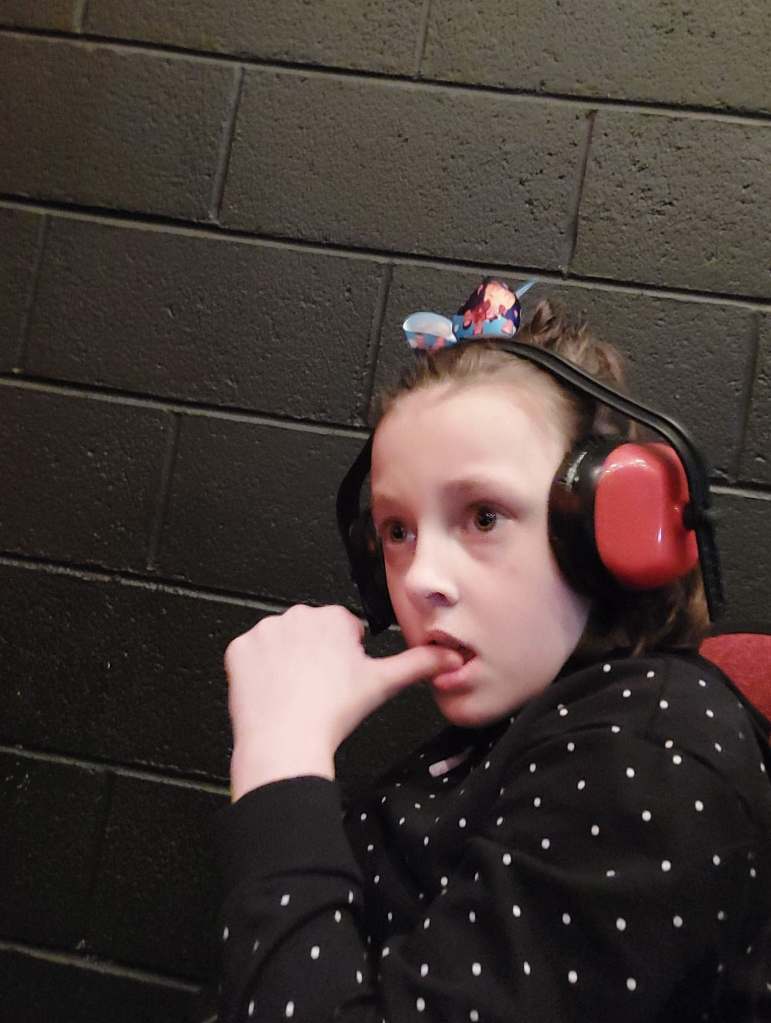 I was a bit iffy bringing her somewhere myself.  She’s much quicker than me, and much more agile, but I bought tickets near the wall so she wouldn’t be able to escape as quickly. When we got there and Penny was exploring her space, I let the kind mom in front of us know that Penny may kick her seat and apologised in advance. The bright side of going to a place with all parents was that I wasn’t as nervous about that. (I did try to keep the kicking her seat to a minimum though, I know that can be annoying).